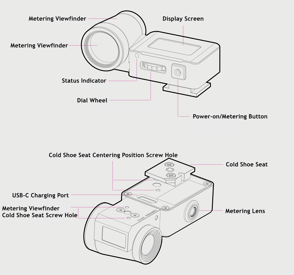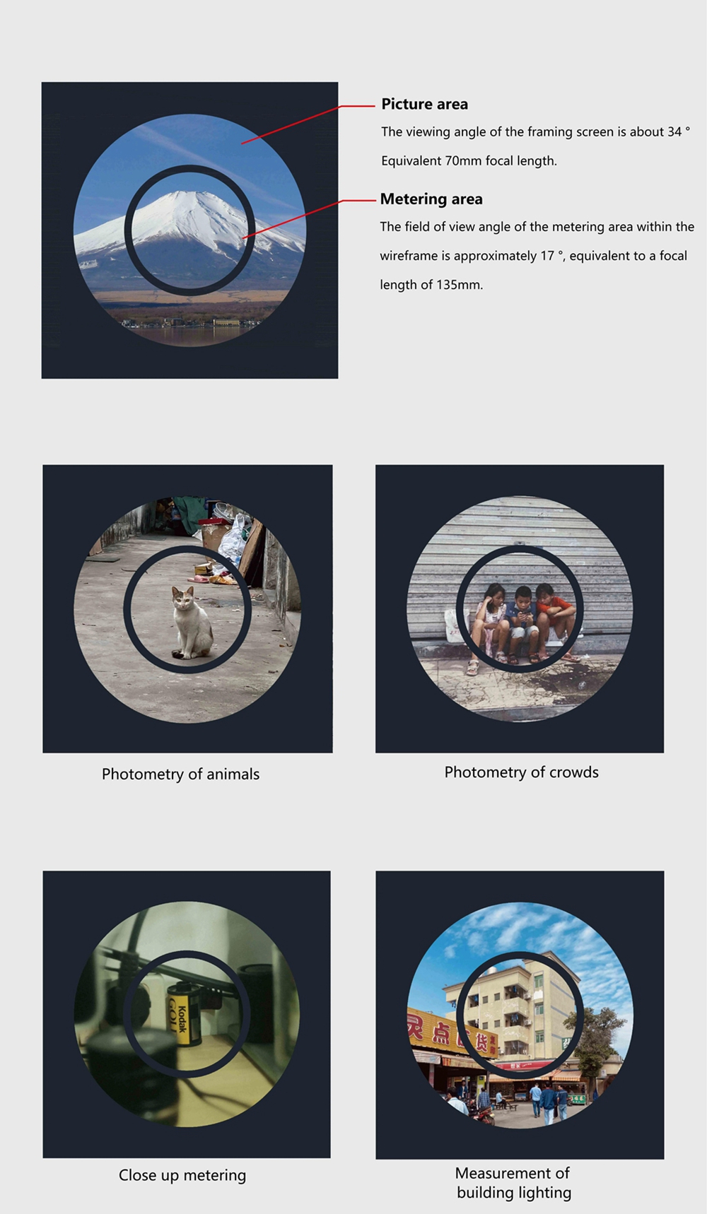 The Area 2S light meter comes with a metering bypass metering viewfinder, which is not on the same optical path as the metering lens and has a 17 degree field of view angle. Therefore, when shooting at close range (within 20cm) and macro range, the scene you observe in the viewfinder is significantly different from the picture measured by the metering lens. At this point, it is not possible to rely on a metering viewfinder to observe the image. It is necessary to directly align the metering lens of the Area 2S light meter with a specific area for measurement.