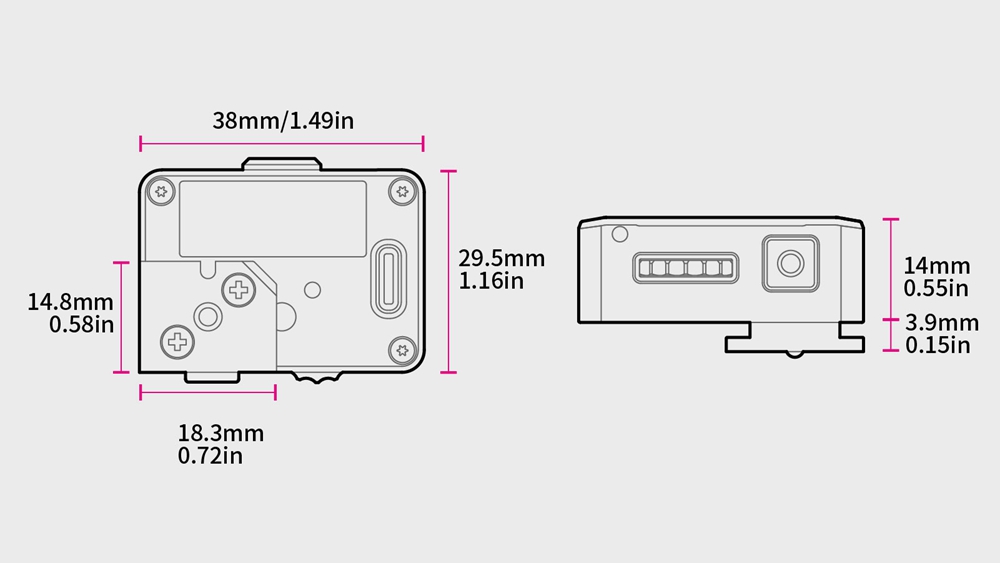 Excluding hot shoe: 38 x 29.5 x 14mm