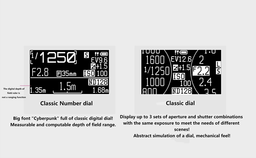 - The classic number dial and classic dial interface can be switched. (The dial has different functions and focuses, and under the "classic dial", three sets of exposure combinations can be obtained.)