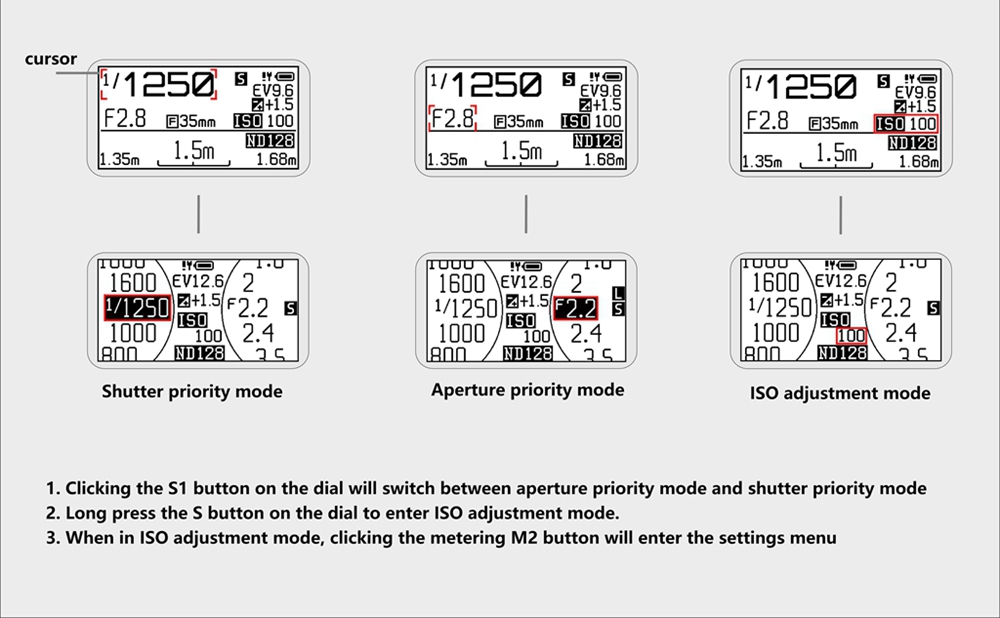 - Press type dial wheel. (Press the dial to switch between shutter priority and aperture priority, long press to enter ISO/system settings)