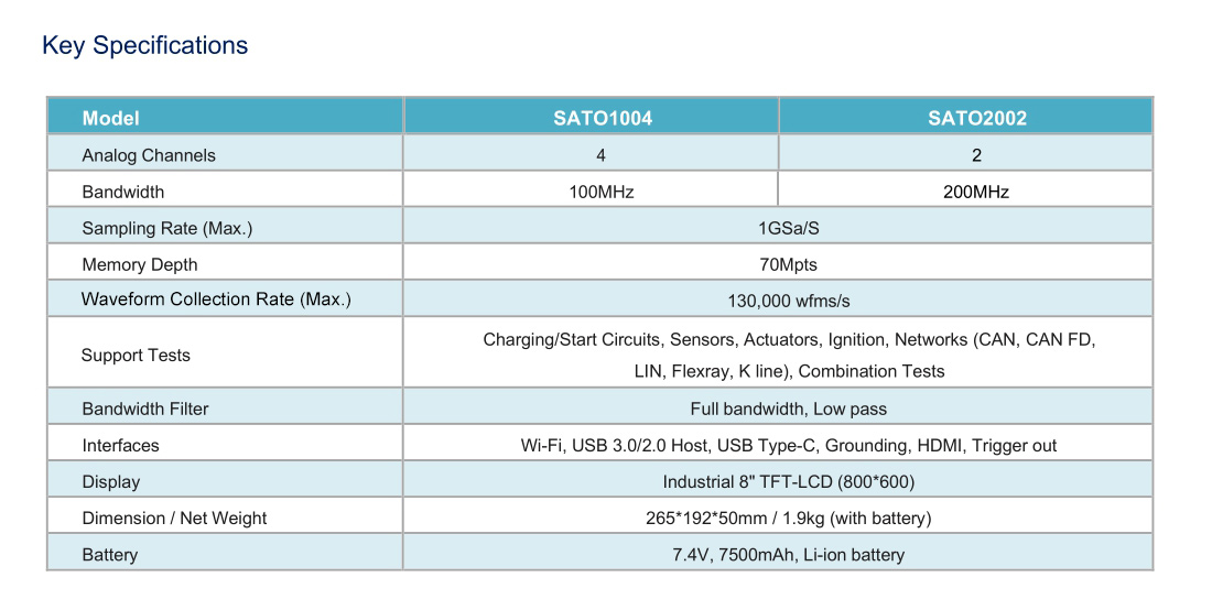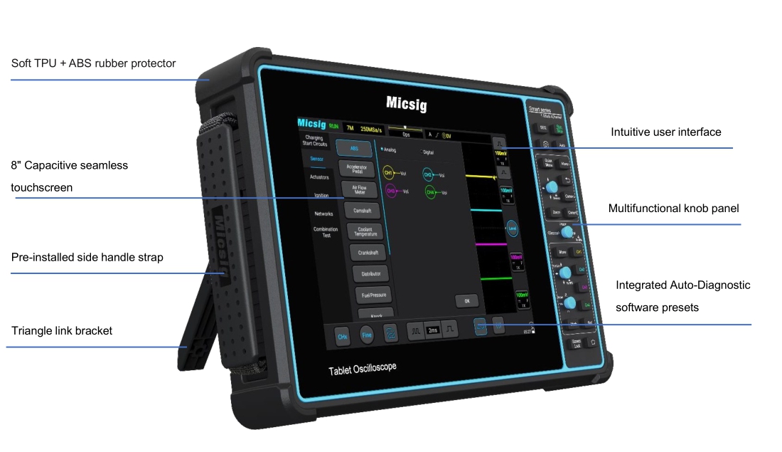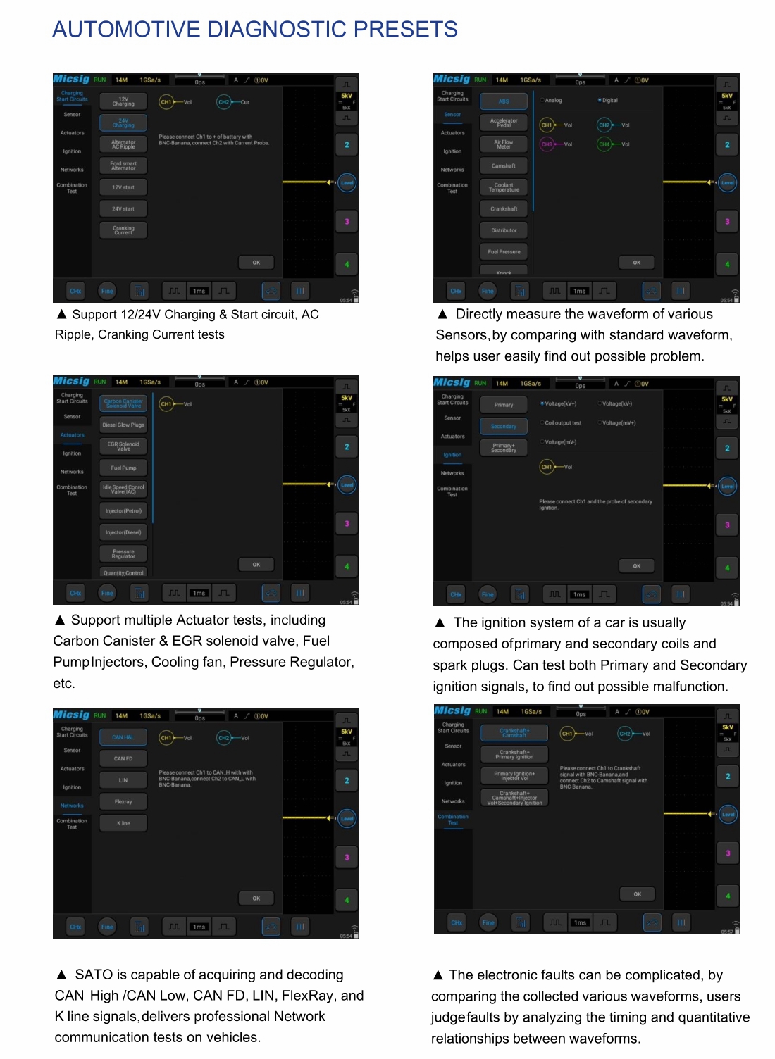 Equipped with highly sensitive digital trigger system and comprehensive automotive diagnostic software preset, the SATO series is able to help mechanics quickly and easily find out all kinds of problem on all types of vehicles, including circuits on Charging/Start up, various Sensors and Actuators, Ignition system, Networks (CAN, CAN FD, LIN, Flexray and K line), etc. Combined with Micsig's unique touch algorithm patented technology, the SATO series brings unparalleled operating experience to automotive users.