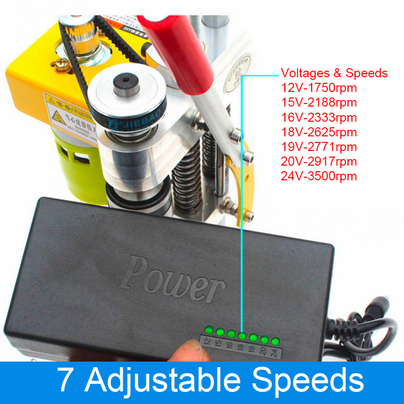 - 7 adjustable speeds: 12V-1750rpm, 15V-2188rpm, 16V-2333rpm, 18V-2625rpm, 19V-2771rpm, 20V-2917rpm and 24V-3500rpm