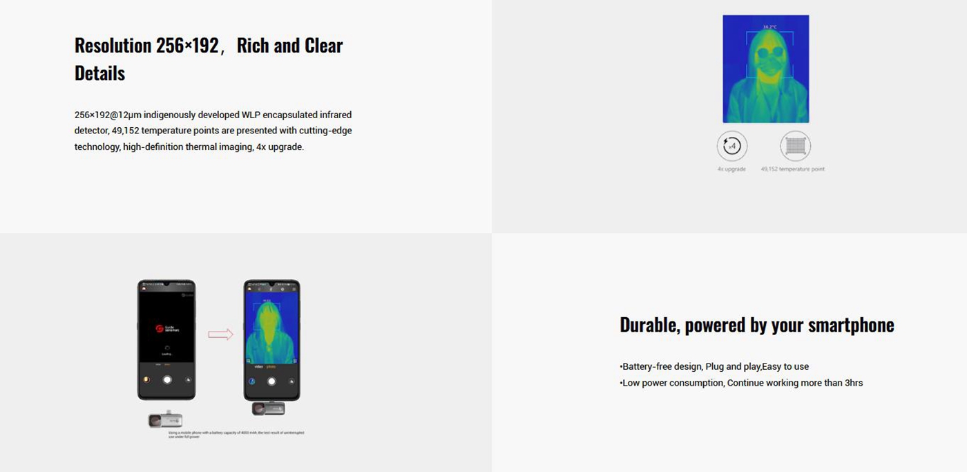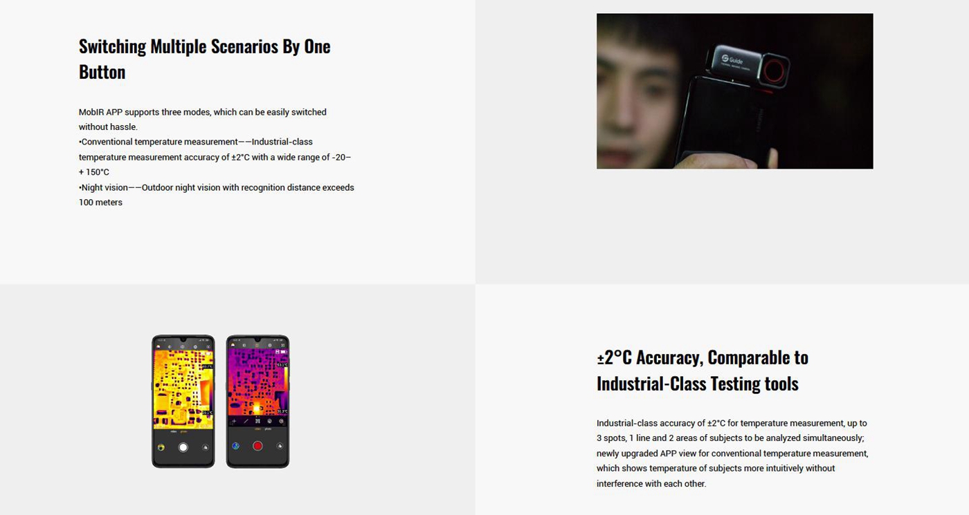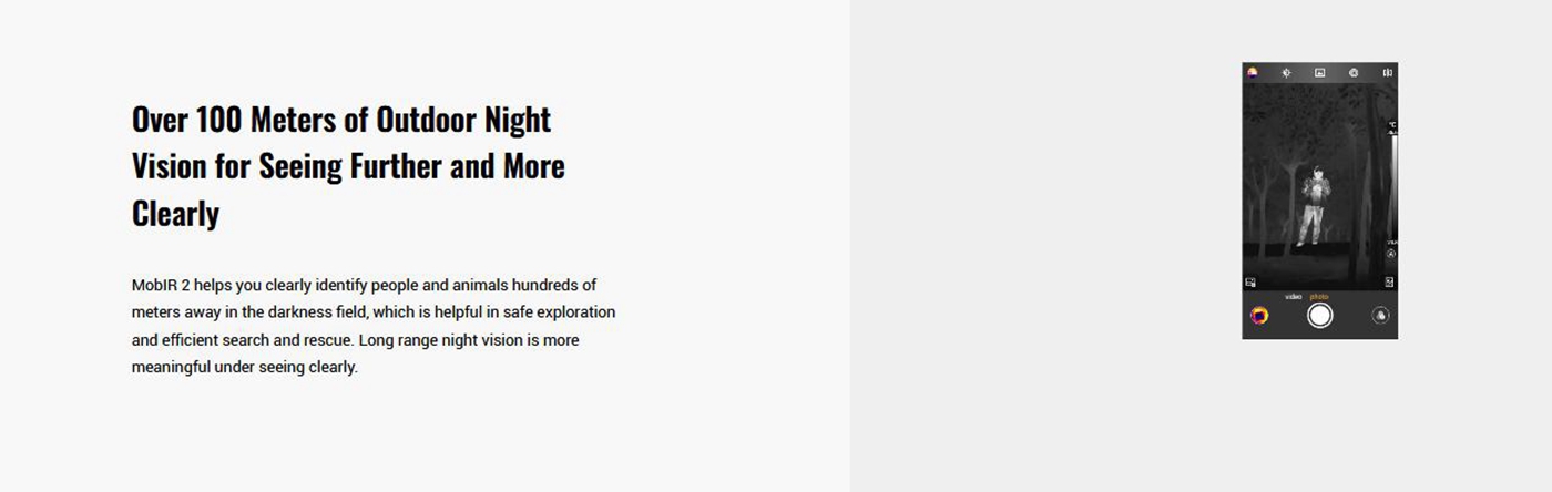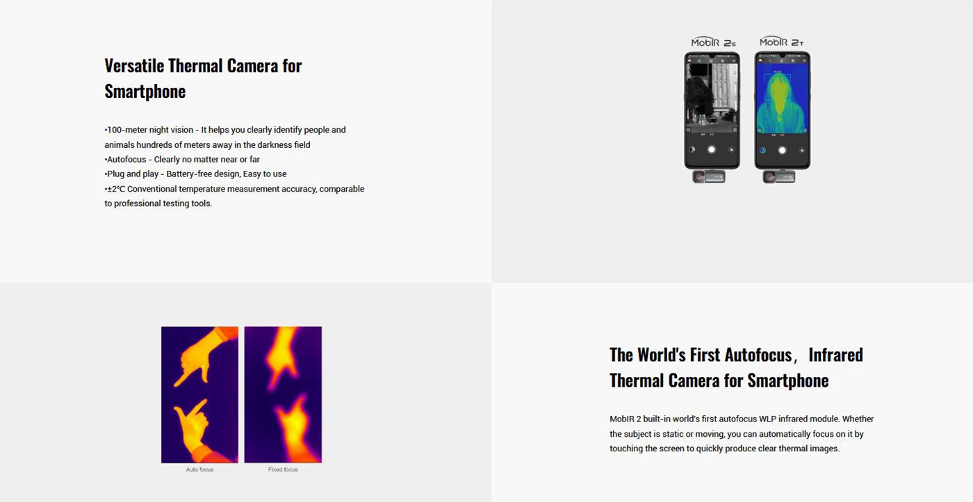 - MobIR 2 series is a new generation of infrared thermal imager for smartphone. Built-in the world's first autofocus WLP infrared module, with higher resolution and performance comparable to professional thermal imaging cameras. This product allows you to see things that you can't see with the naked eye , It can realize real-time temperature measurement, night vision, photography, video and other functions through the mobile phone APP. It is an all-round partner for your daily work, home life and adventure travel.