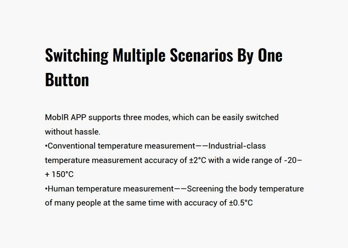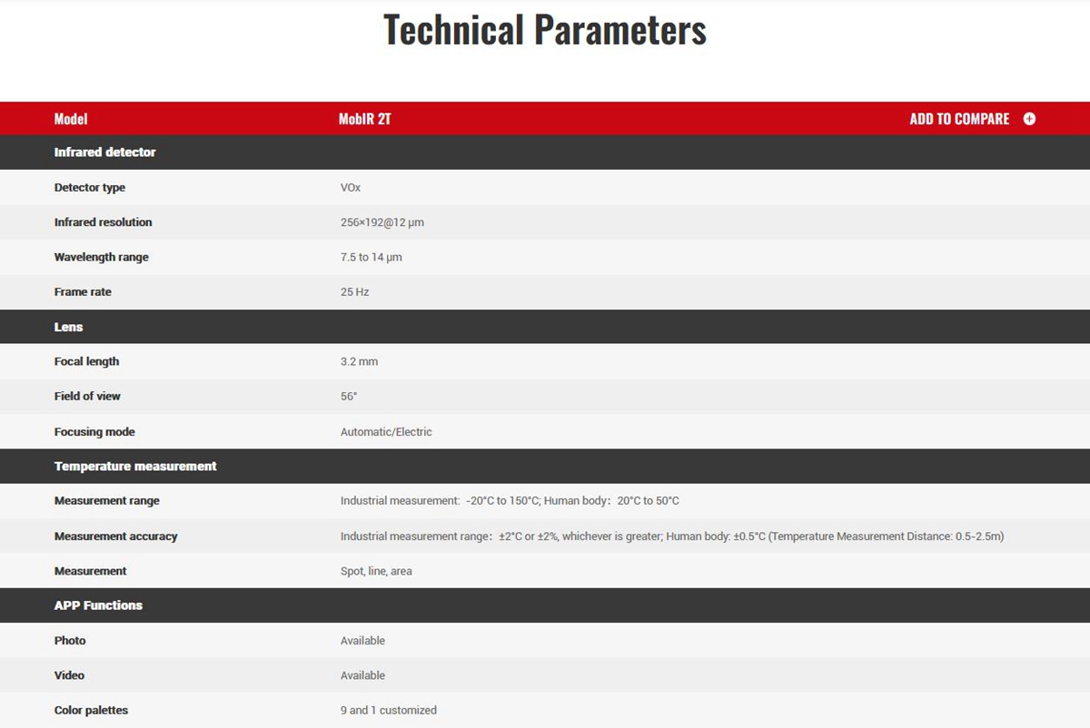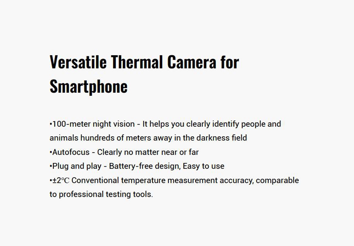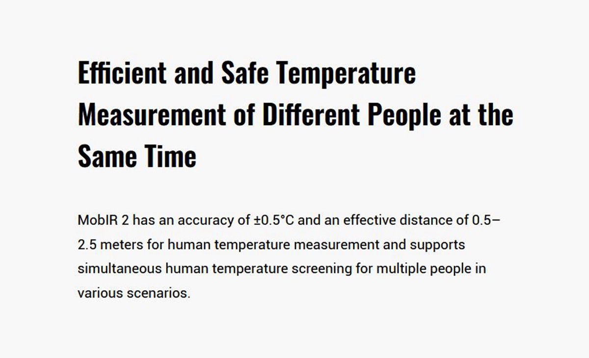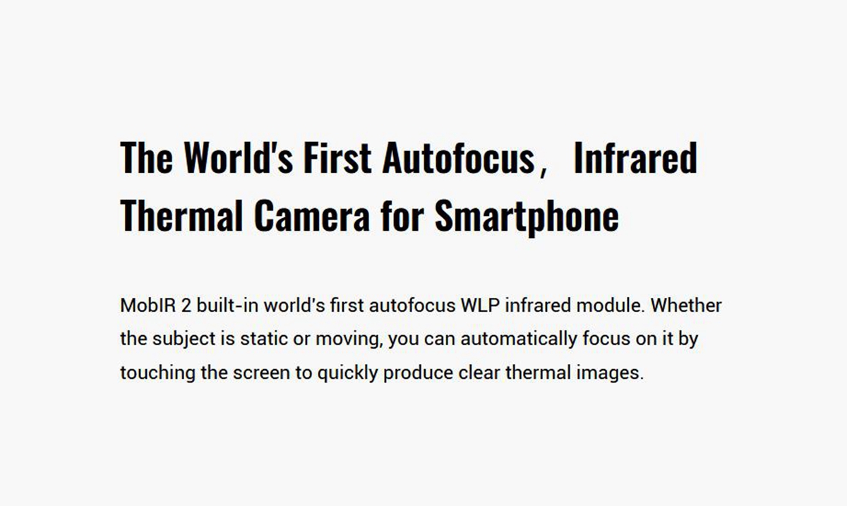 - MobIR 2 series is a new generation of infrared thermal imager for smartphone. Built-in the world's first autofocus WLP infrared module, with higher resolution and performance comparable to professional thermal imaging cameras. This product allows you to see things that you can't see with the naked eye , It can realize real-time temperature measurement, night vision, photography, video and other functions through the mobile phone APP. It is an all-round partner for your daily work, home life and adventure travel.