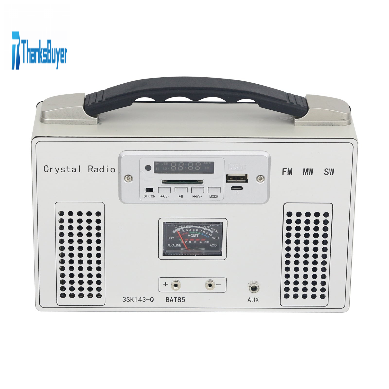- The reverse side is an FM radio with MP3 music player, which is not connected to the front side. The 3.7V 18650 rechargeable lithium battery is used for power supply, 30 x 70 speakers and support remote control, and the level meter in the middle is actually a pass meter, which is used to test the continuity of the crystal radio. It is very practical. The whole machine is 200 x 120 x 80 (mm).