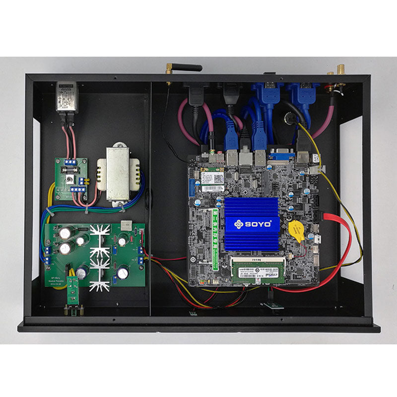 Traditional computers are powered by ATX switching power supplies. The switching power supplies have very strong high-frequency noise interference, resulting in scattered and rough sound. This player adopts linear low-dropout regulated power supply for pure power supply. It is designed without fans. Ultra-low-power 4-core N3160 motherboard not only improves the sound cohesion and background purity, but also eliminates annoying fan noise. It can be used with a USB decoder, and the sound is better than that of PC using a traditional switching power supply, and that of ARM core digital broadcasting.