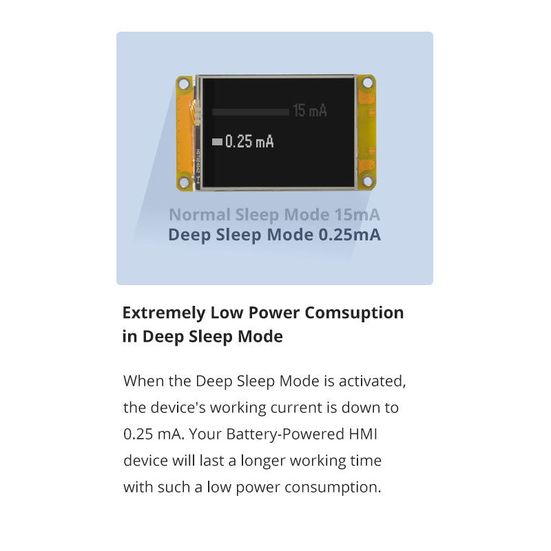 - Extremely Low Power Consumption in Deep Sleep Mode: When the Deep Sleep Mode is activated, the device's working current is down to 0.25 mA. Your HMI device will last a longer working time with such a low power consumption