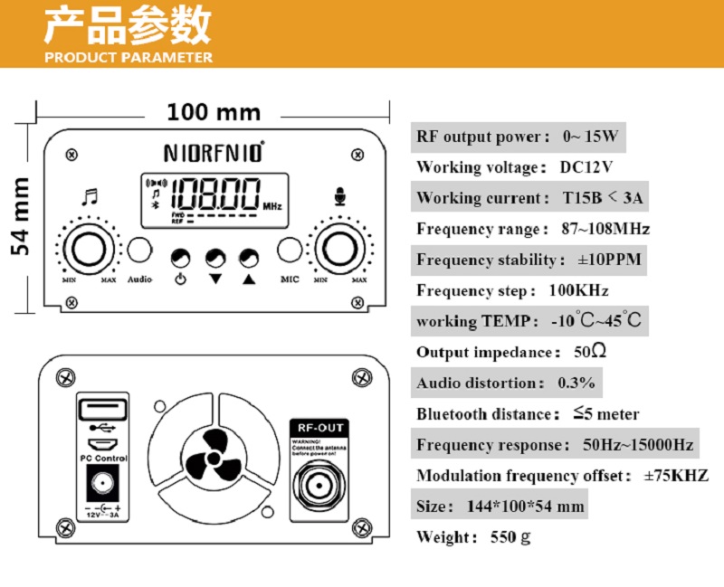 NIO-T15B 15W FM Transmitter Kit Bluetooth PC Control U Disk HiFi Stereo (CA-200N Antenna Version)