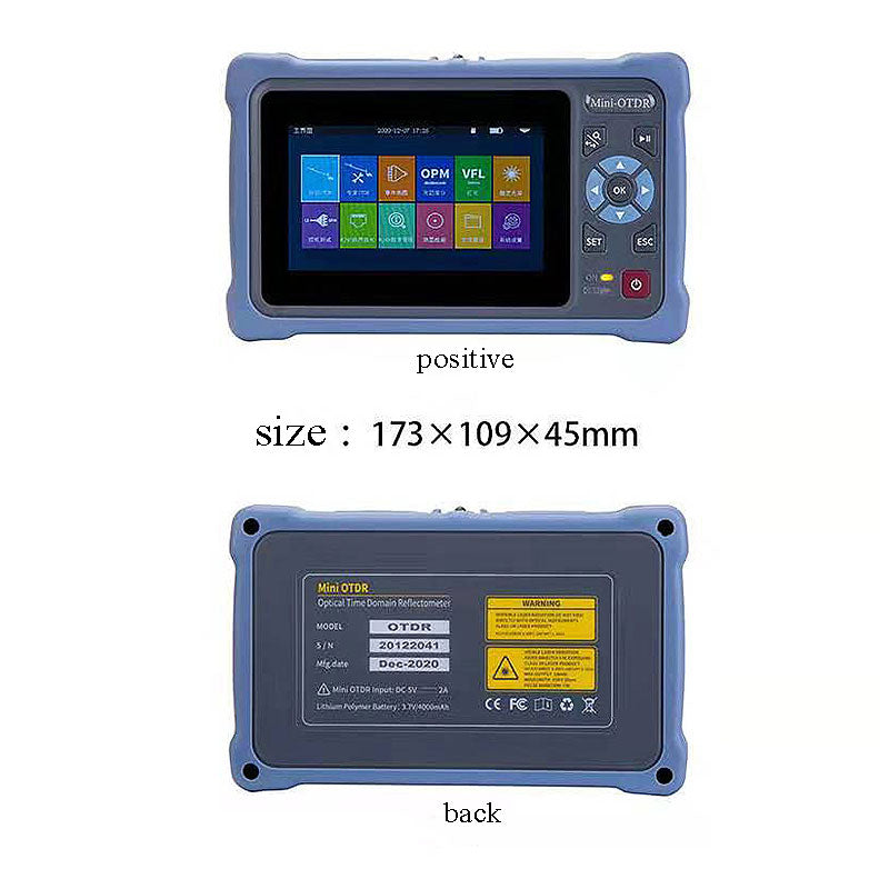 - 12-in-1 functional module: automatic OTDR, expert OTDR, event map, optical power meter, visible red light, adjustable light source, optical loss test, RJ45 network cable sequence, RJ45 network cable length measurement, RJ45 Network cable tracking, flashlight, end face detection (optional)