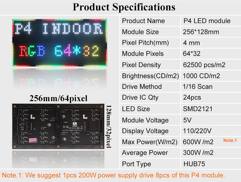 P4 Indoor LED Display Board RGB Full Color LED Screen Panel Module 256x128MM/10.1x5" 64*32 Pixels