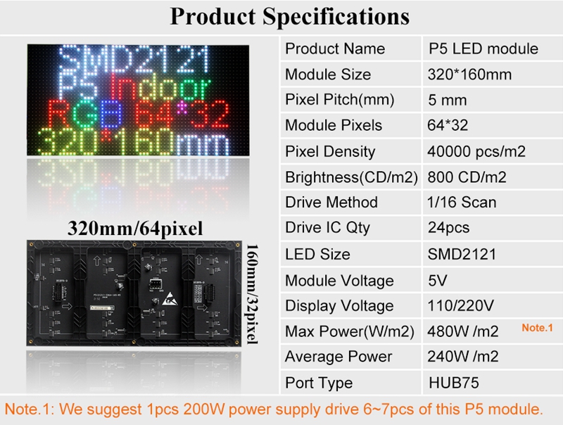 P5 LED Display Board RGB Full Color LED Screen Panel Module Size 320x160MM/12.6x6.3" 64*32 Pixels