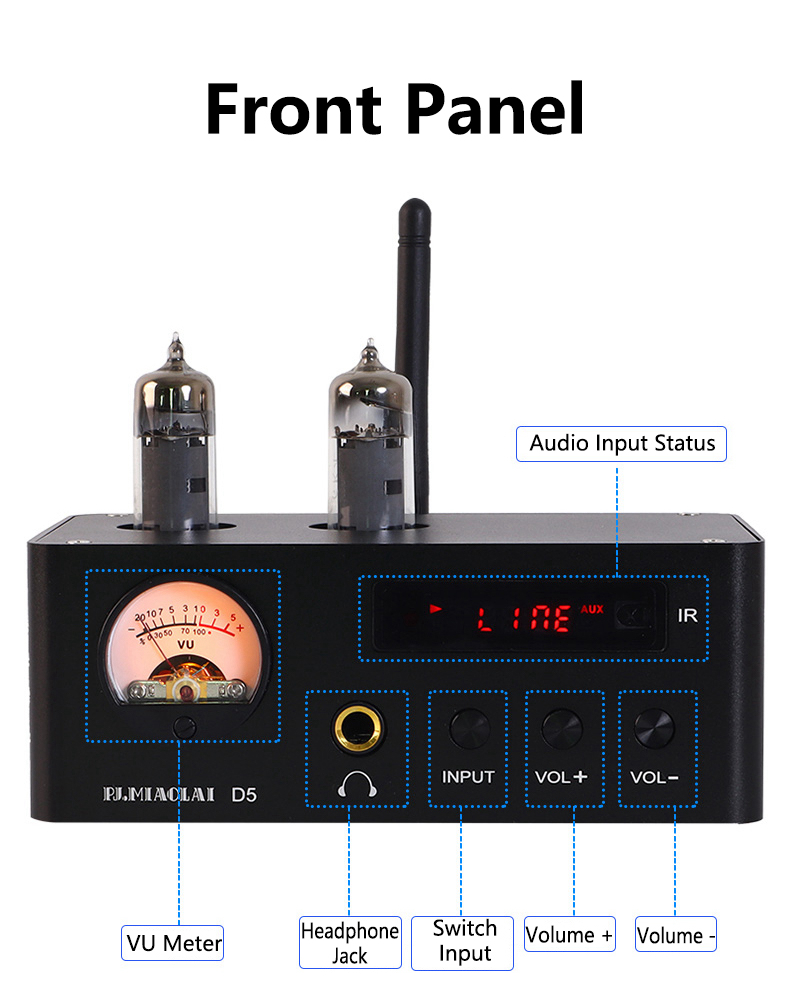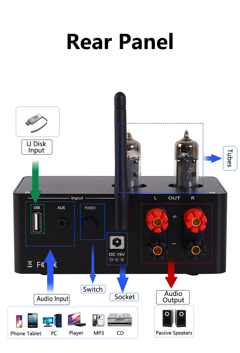 - Hifi tube power amp supports Bluetooth 5.0, 3.5mm audio, U disk and multiple groups of audio inputs