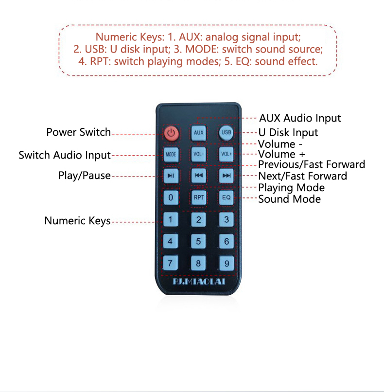 - Input interface: U disk, AUX (analog), and Bluetooth