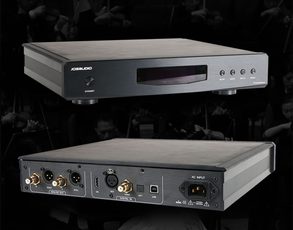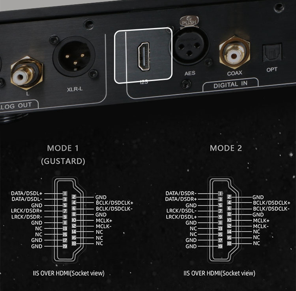 - Output: RCA-R, RCA-L, XLR-R, XLR-L (balanced); Input: USB, OPT, COAX, AES, I2S.