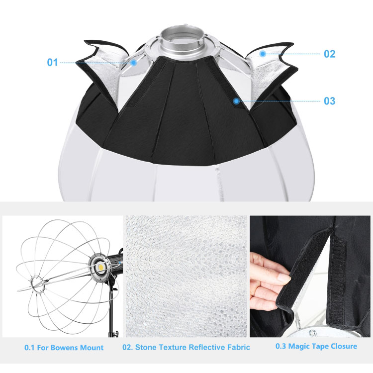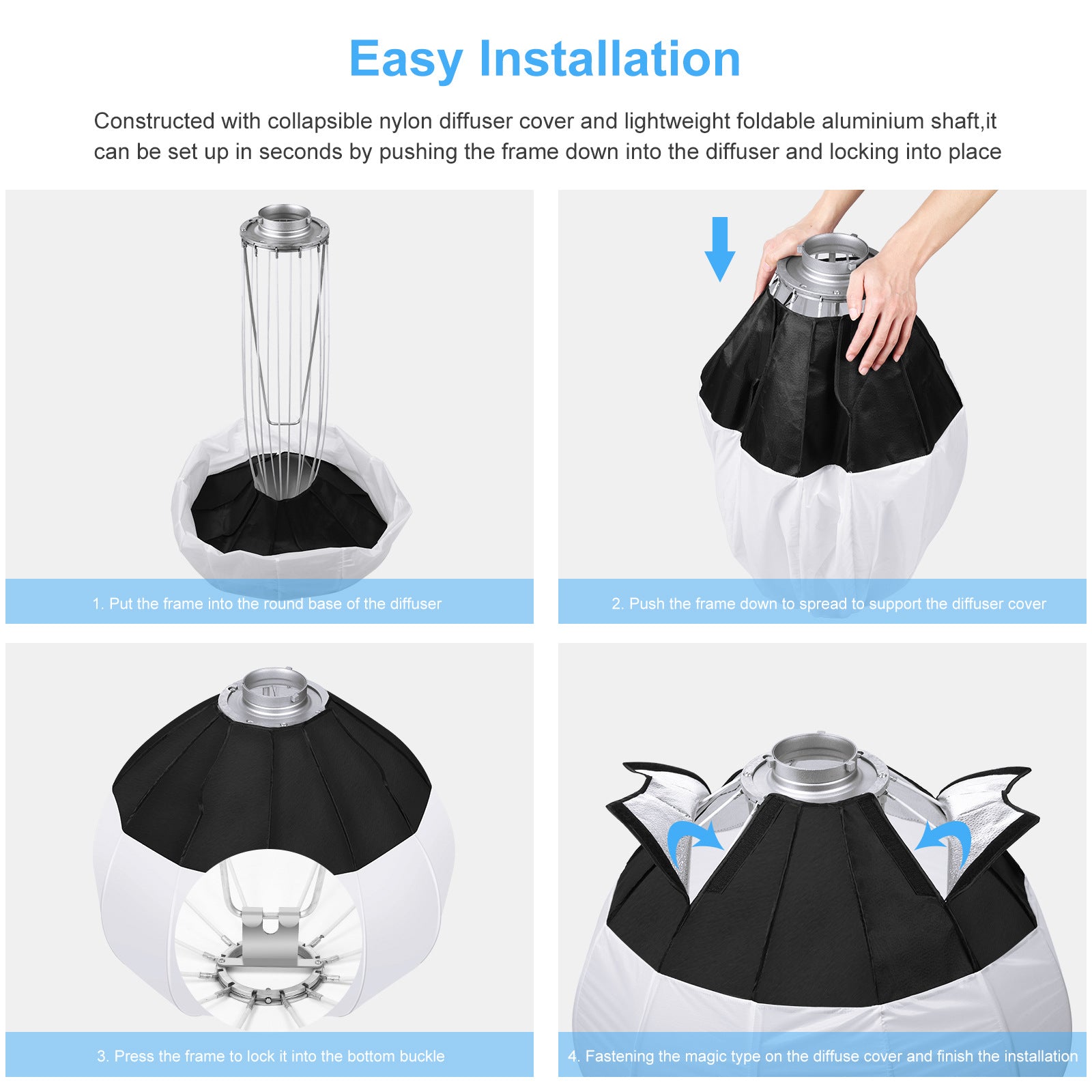 1. This spherical softbox can pop open and be ready to use in mere seconds, allowing you to set up lights, faster. Foldable lantern style, easy to open and close.