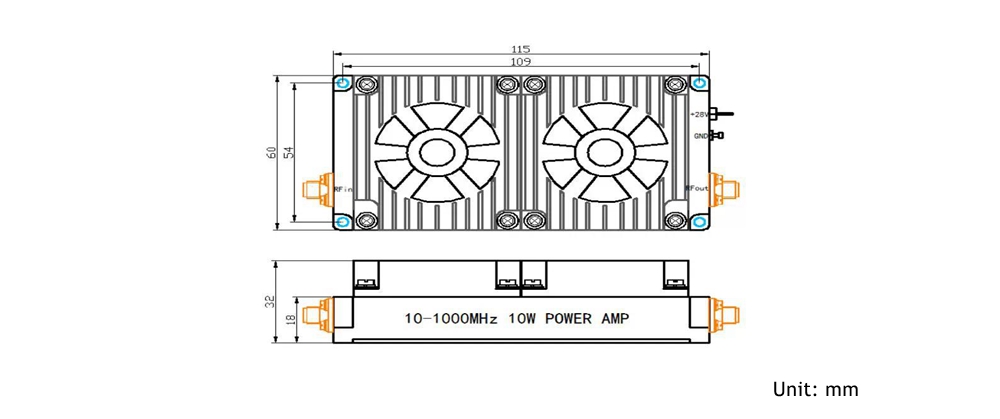 - The 10-1000MHz 10W broadband RF power amplifier is a broadband power amplifier that can achieve small signal linear gain of up to 40dB in the broadband range, with a typical saturation output power of up to 10W. It comes with a built-in cooling fan, which can ensure independent long-term operation without other cooling methods.