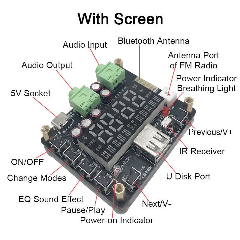- Supported modes: 5.0 Bluetooth / U disk / external input / FM radio / computer sound card / EQ sound effect