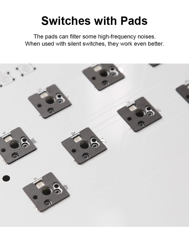 - Switches with pads: The pads can filter some high-frequency noises. Used with silent switches, they work even better
