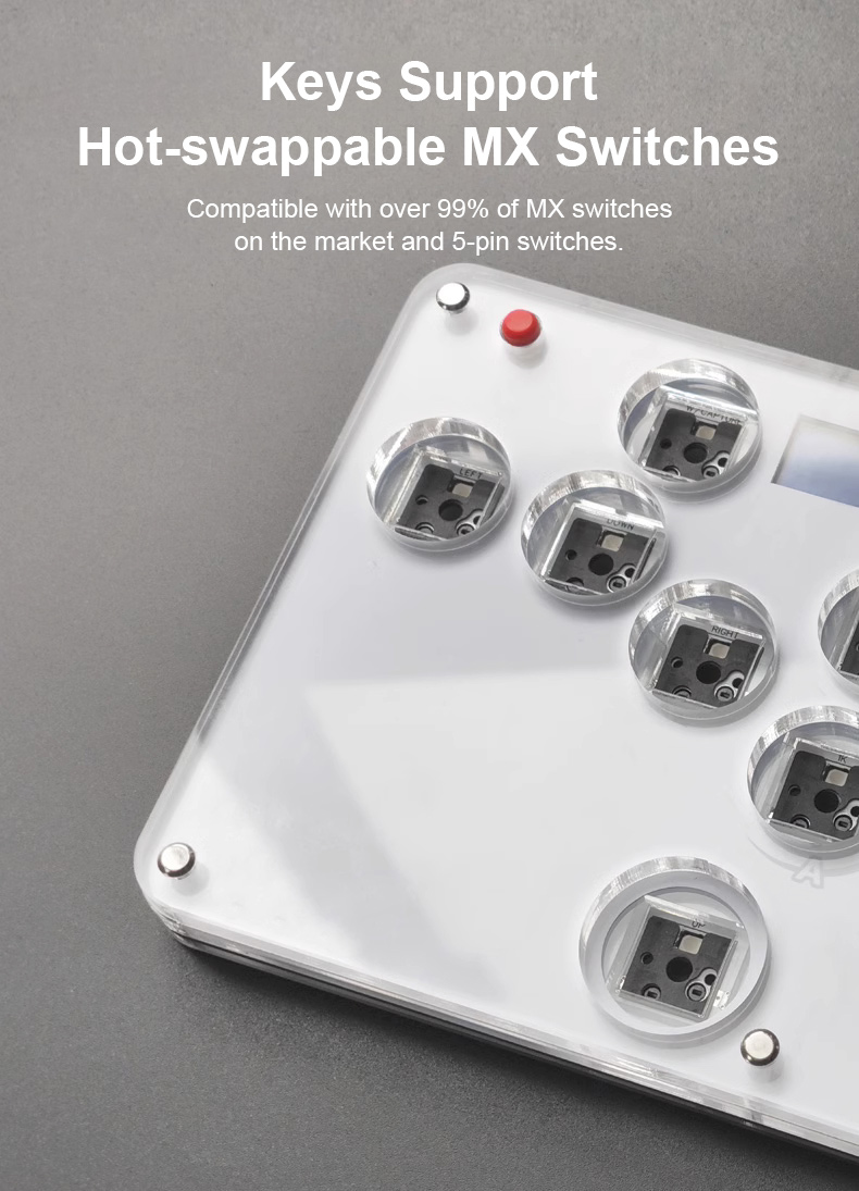 - All the buttons support hot-swappable MX switches. They are compatible with over 99% of MX switches on the market and 5-pin switches