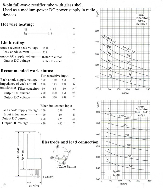 274B is a high-performance rectifier tube. It adopts a special cathodic electrophoresis process; the surface is smooth and firm and has sufficient emission current. An ultra-high vacuum exhaust machine is used to exhaust it for a long time. The vacuum degree in the tube is more than 100 times higher than that of 5U4G. At the same time, it adopts high-pressure refining to improve the stability of the whole tube. The anti-peak voltage of the tube can reach more than 850V, and the output DC current is 150MA, and it will not be sparked under high voltage. This is an ideal rectifier tube, which can be used as the rectifier of tube amplifier.