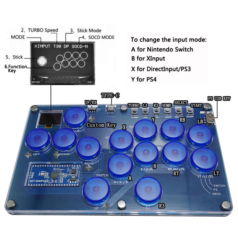SimPlayer SP2040-14 14-Button Hitbox Arcade Controller with 2 UP Buttons (Transparent Blue Keycaps)