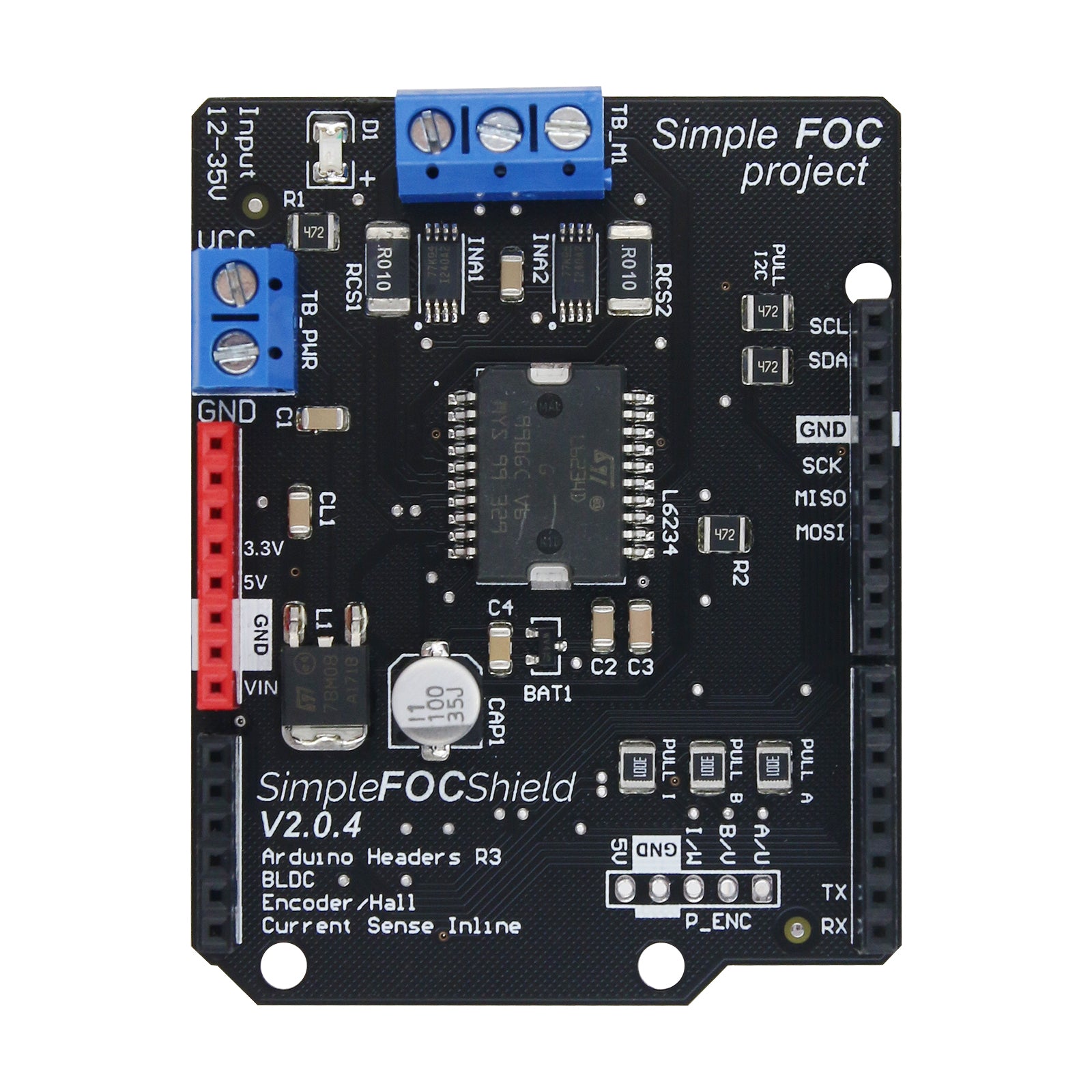 This is an open-source low-cost Brushless DC (BLDC) motor driver board intended primarily for low-power FOC applications up to 5Amps. The board is for Arduino UNO and all the boards with the standard headers for Arduino. The SimpleFOCShield, in combination with the SimpleFOClibrary provides user-friendly way to control BLDC motors both in hardware and software.