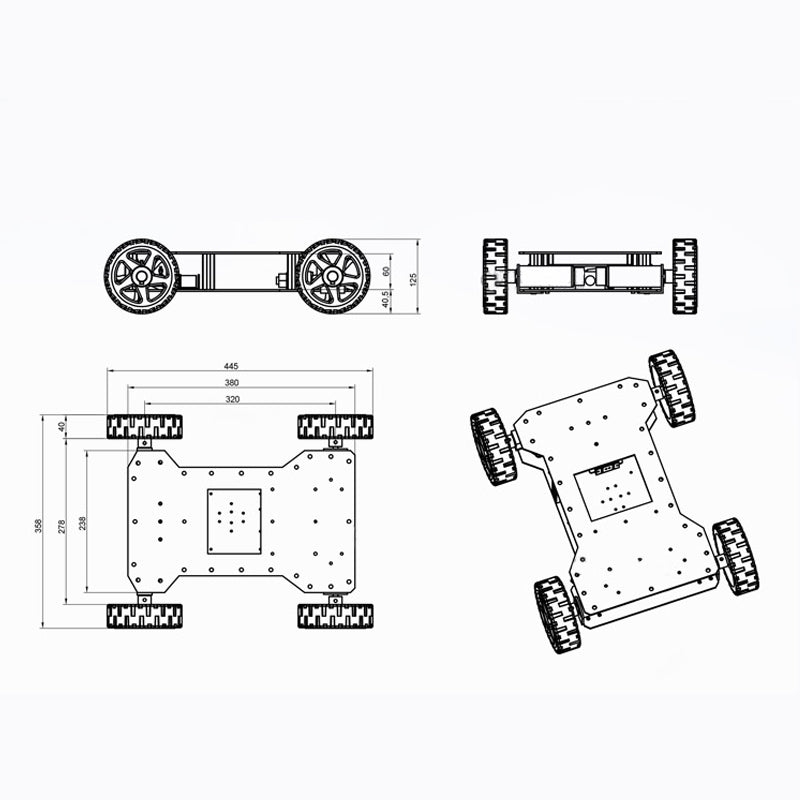 The product adopts solid rubber tires, suitable for indoors or outdoors. The front wheels have steering mechanism, and the rear wheels are powered by dual motors. The rear wheels cooperate with the front wheels to steer through differentials, and the car moves very smoothly.  The rear wheels are also equipped with a pendulum suspension system, adapting to uneven ground and small obstacles.