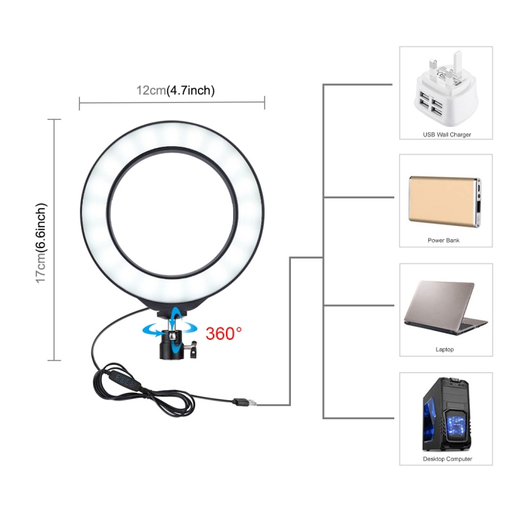 5. The USB ports can be used with multiple devices, such as connect computer host, laptop, mobile power and USB charger. You will be able to enjoy LED ring light at any time free.