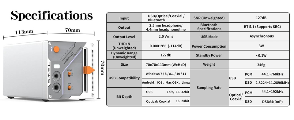 USB: PCM 44.1-768kHz; DSD 2.8224-11.2896MHz