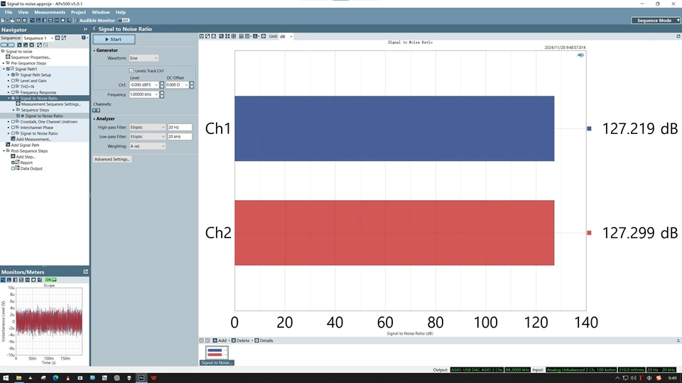- SNR (non-weighted): 127dB