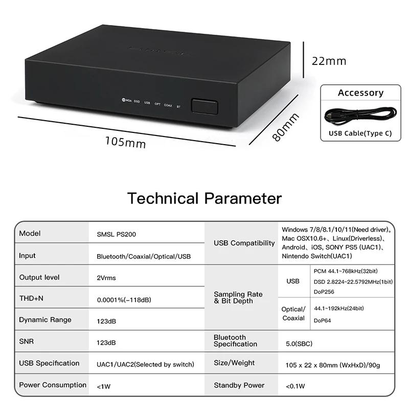 SMSL PS200 HiFi Audio Decoder DAC ES9039Q2M USB1.0/2.0 Compatible with PS5/Switch UAC Support MQA-CD Decoding