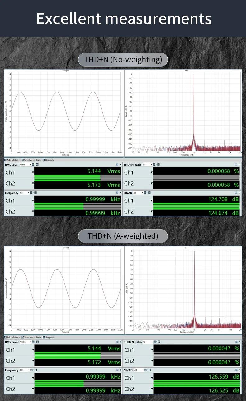 - THD+N: 0.00005% (-124.5dB Aweighted)