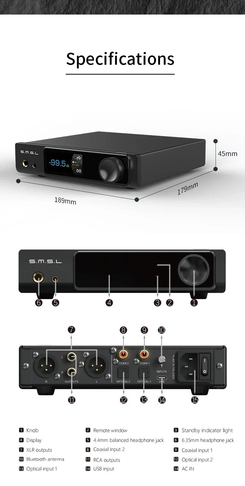 - Input mode: USB, optical fiber x 2, coaxial x 2, Bluetooth