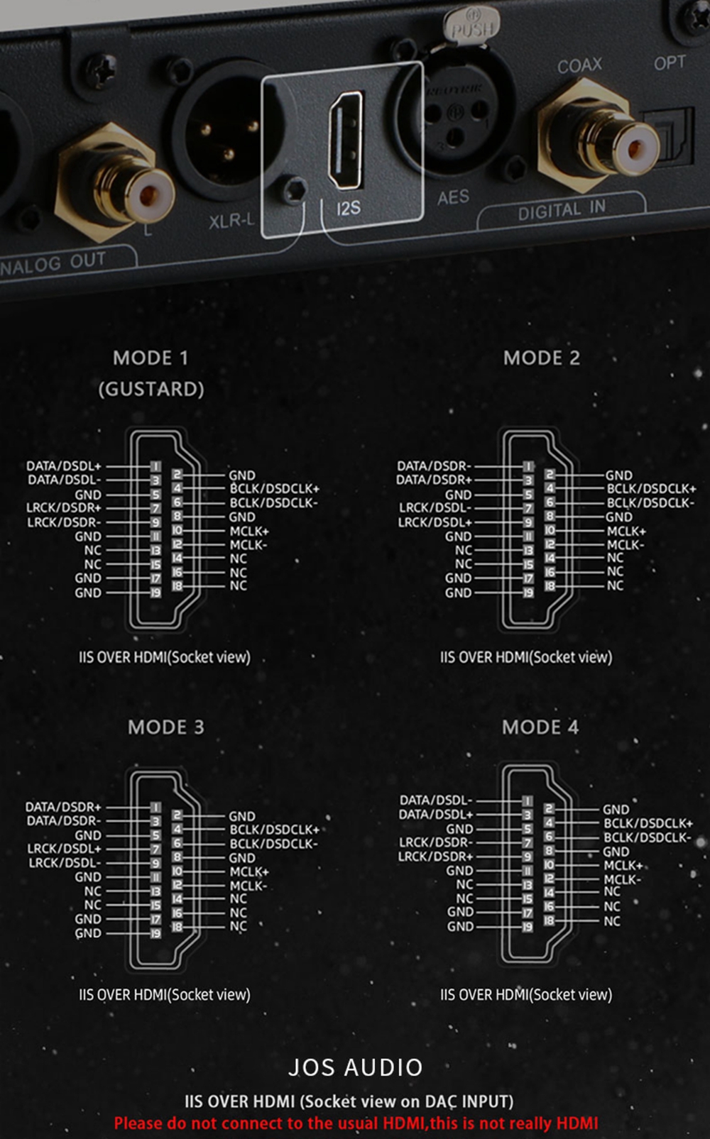 - Output: RCA-R, RCA-L, XLR-R, XLR-L (balanced); Input: USB, OPT, COAX, AES, I2S.