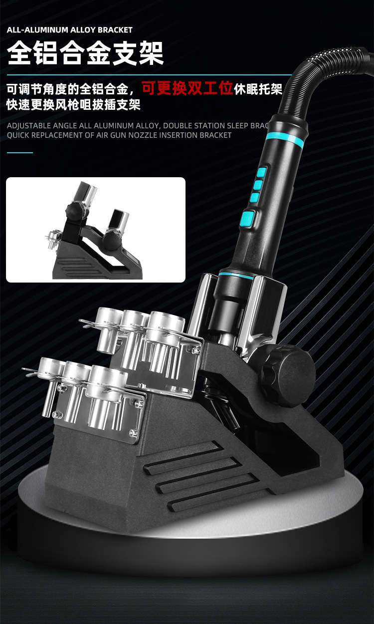 - Adjustable angle all aluminum alloy, double station sleep bracket, quick replacement of air gun nozzle.