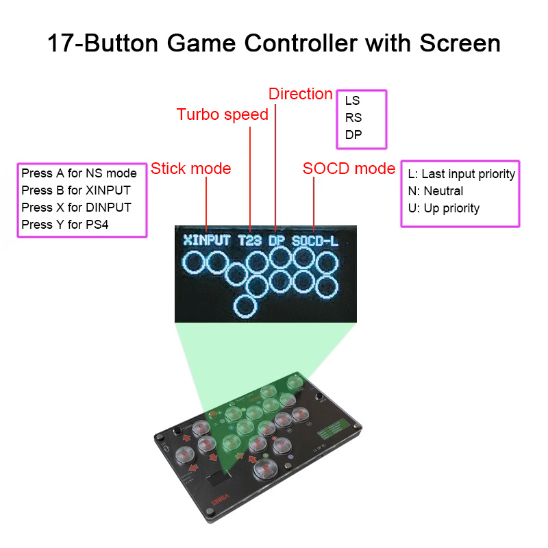 SUNGA 17-Botton Mini Arcade Controller Fight Stick Gaming Controller with Screen for Hitbox PC/PS4