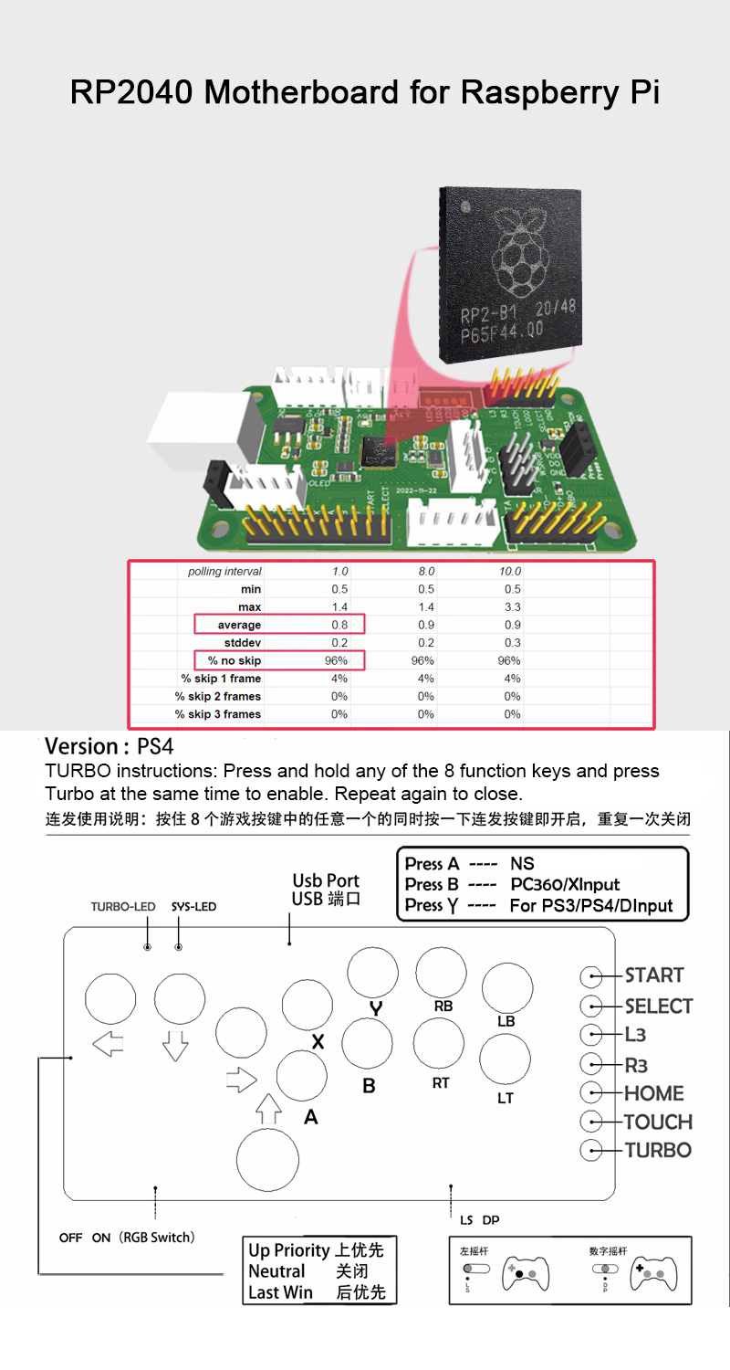 - This version adopts RP2040 motherboard for Raspberry Pi: Dual-core processor for ARM Cortex M0+, up to 133MHz operating frequency, 0.8ms delay, no frameskip rate reaching 96% and 4% within 1fps.