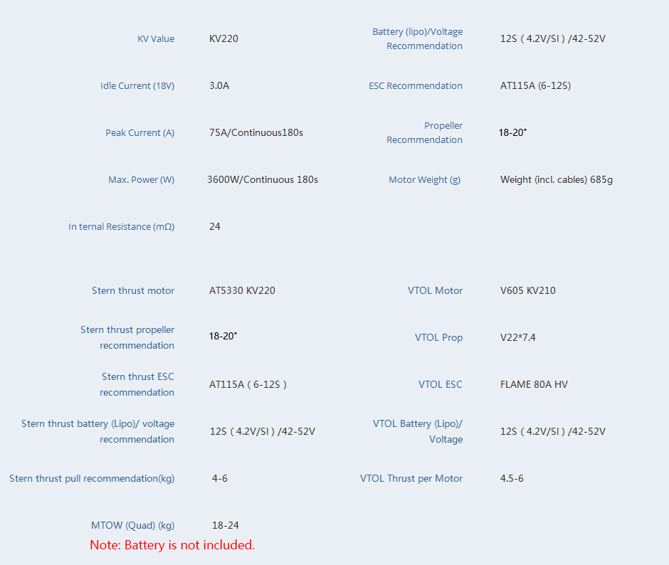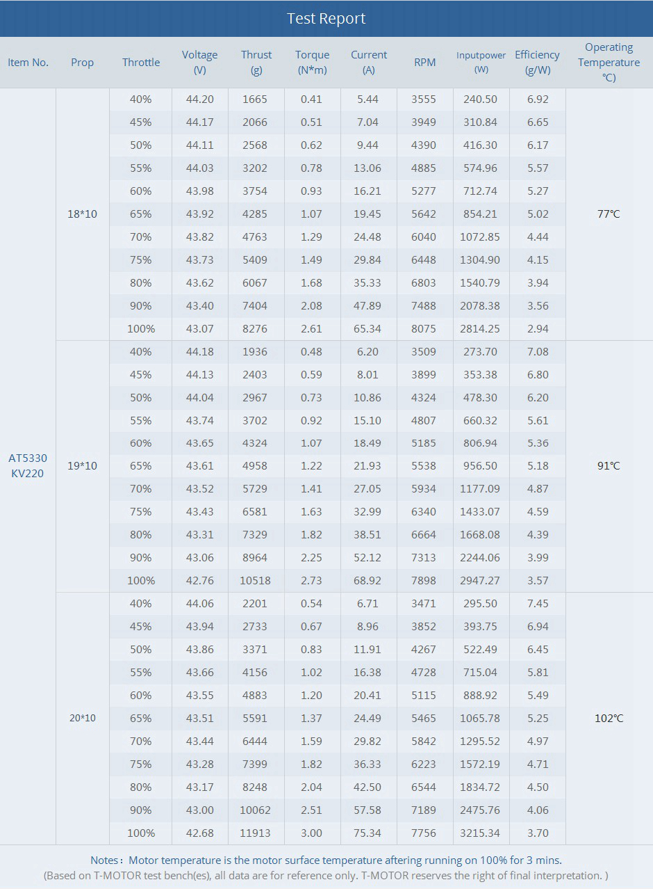 - VTOL tail push power. King of energy-saving. Take-off weight 20KG, match 19x12 propellers. The AT5330 is the tail push power system for VTOL. It has the advantages of fast response speed and linear throttle output, which ensures the precise flight of the UAV and long endurance flight