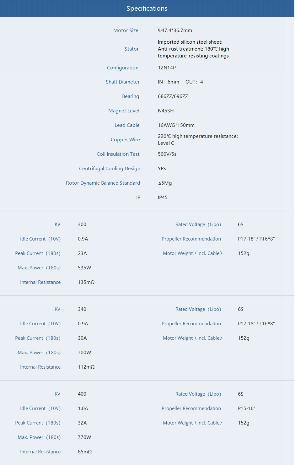 - Remarkable cooling and long endurance. With reasonable airflow channel design, heat flux increases by 18%. High-performance iron core material, high slot rate and reduced heat generation ensures long-lasting flight. Efficiency goes up to 8g/W on 60% throttle