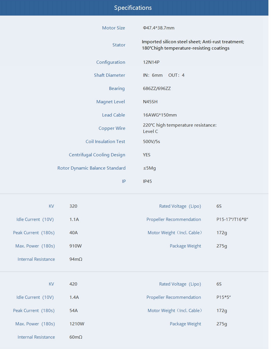 - Remarkable cooling and long endurance. With reasonable airflow channel design, heat flux increases by 18%. High-performance iron core material, high slot rate and reduced heat generation ensures long-lasting flight. Efficiency goes up to 8g/W on 60% throttle