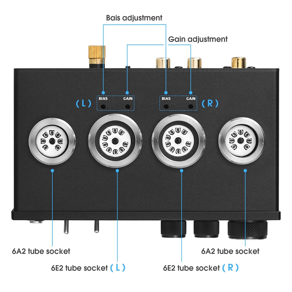 - The bias and gain of two 6E2 tubes are set well before shipping, please pay attention to the R/L channel markings on the tubes, don't insert them wrongly during installation.