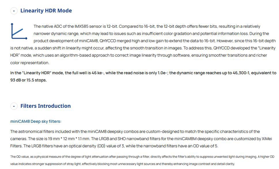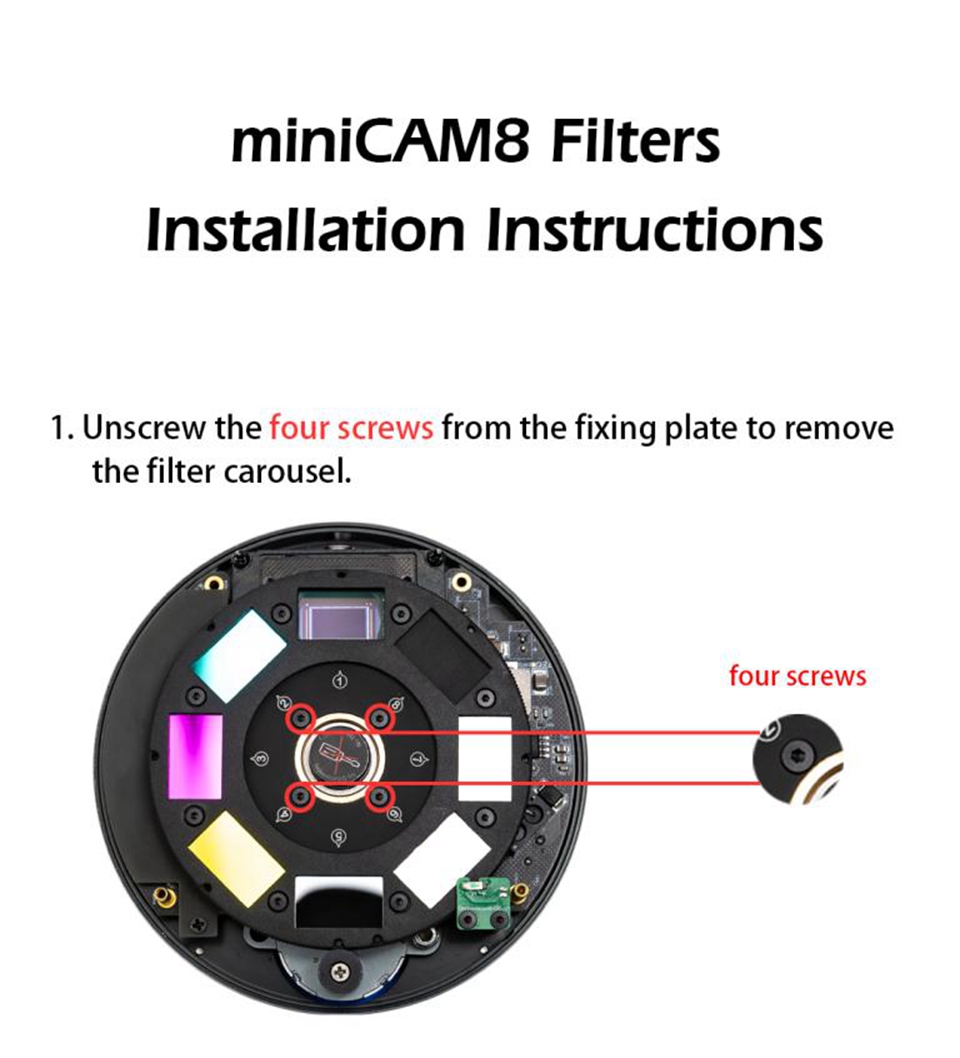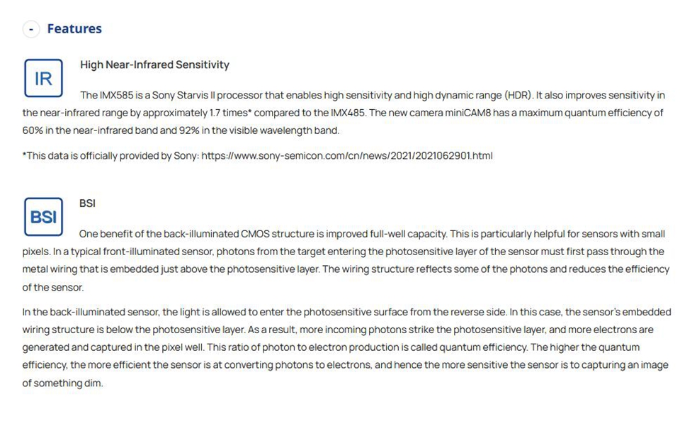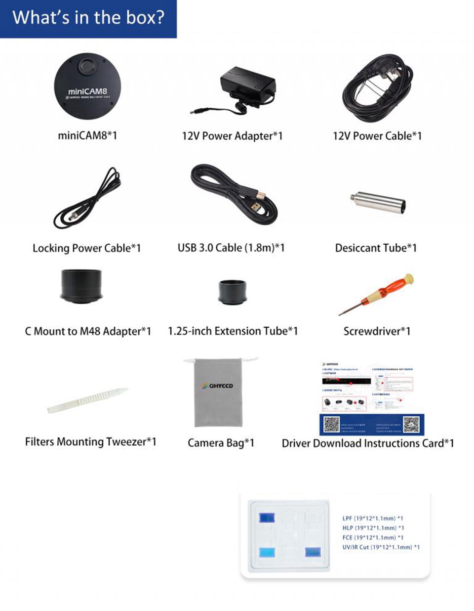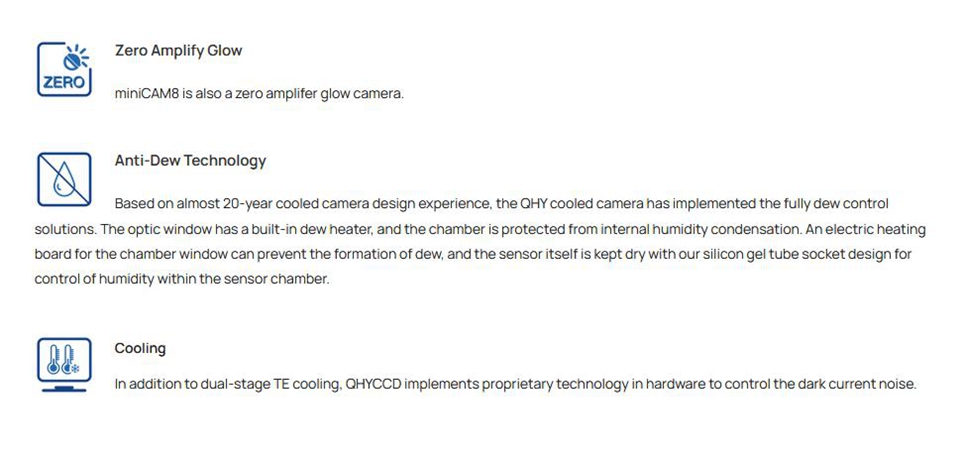 - So often, compactness in astroimaging is achieved at the expense of some other critical feature found in multi-component cooled systems, such as sensor quality or thermoelectric cooling, etc. Such is not the case with the new miniCAM8M. Based on IMX585 8 MP sensor for Sony, the miniCAM8M includes full TE cooling capable of reaching a delta of -45℃ from ambient along with a built-in 8-position filter wheel for complete LRGB and narrowband imaging.
