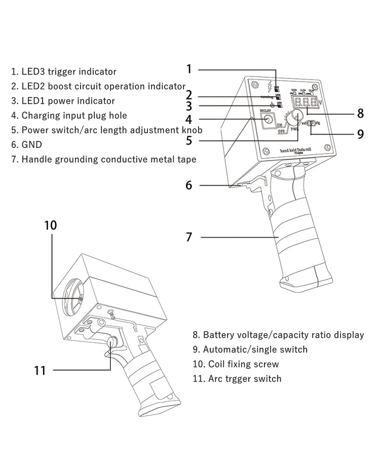 - During the initial installation and use of the coil, the user may press the switch without generating an arc, and the indicator light may also turn off. At this time, the user needs to restart the device and place the coil close to metal objects or wooden tabletops to reduce the insulation value between the coil and the air, so that the coil can better excite the arc and resume normal use.