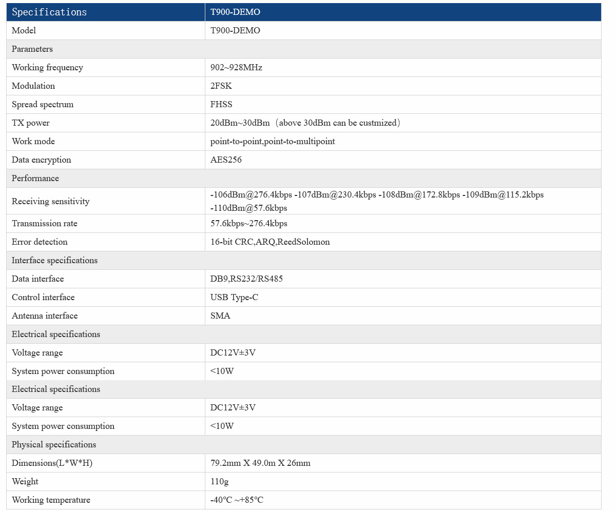 T900-DEMO adopts point-to-point (PP) and point-to-multipoint (PMP) network communication technology to provide users with secure and high-performance wireless serial communication. It can be used in low-cost OEM integration designs. When properly configured and installed, the T900-Demo enables long-range and high-speed communication. It is a frequency-hopping system within the 902-928MHz ISM frequency band. Its Frequency Hopping Spread Spectrum (FHSS) technology provides wireless asynchronous data transmission based on serial port, and satisfies most devices using serial communication.