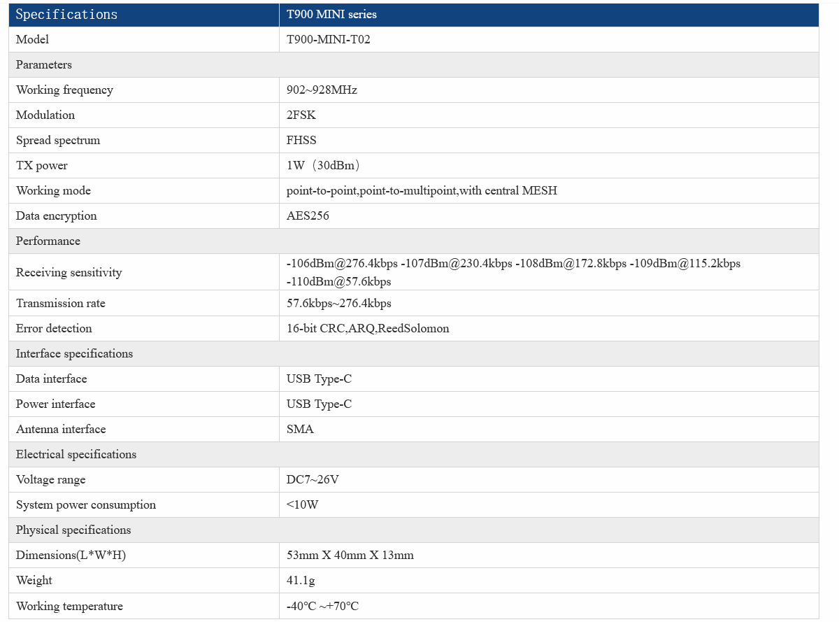 T900-MINI-T02 is a miniaturized data transfer radio of the T900 Honeybee series. The T900 Honeybee series include T01 and T02 models. T02 uses Type C interface and is generally used for ground end. It has the advantages of small size, high integration and high sensitivity. T02 operates within the 902~928MHz frequency band. In a good environment the maximum transmission distance can reach 60km. This product is suitable for UAV,inspection, monitoring, etc.