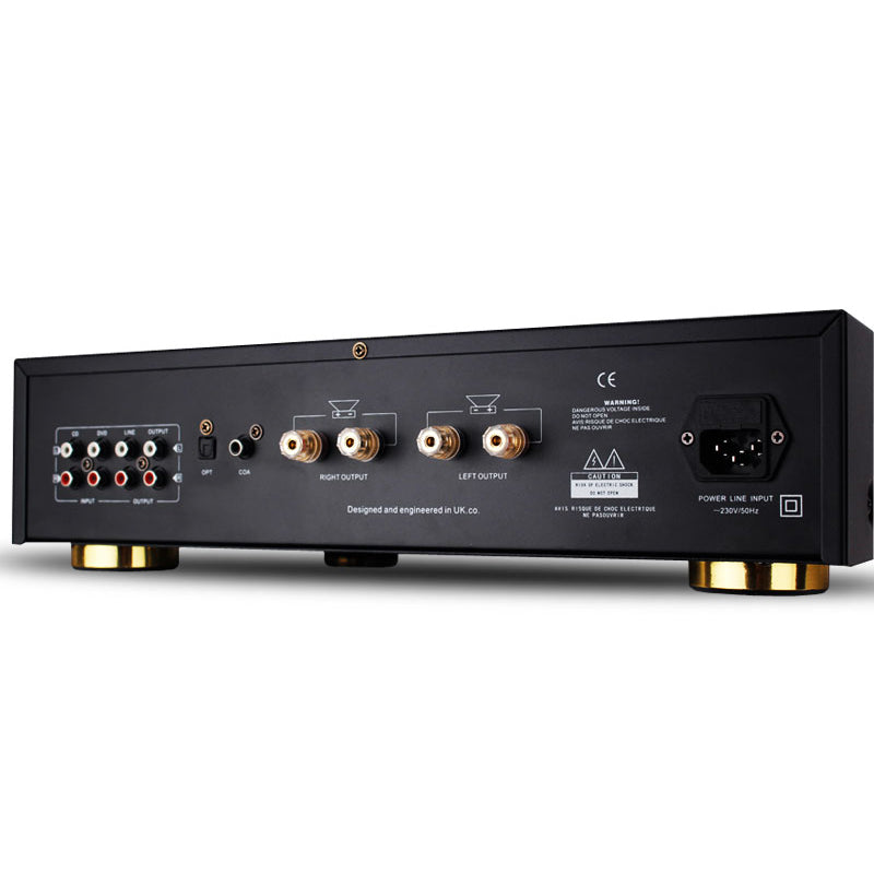 High-power copper transformer and power supply filter capacitors are used; the amp adopts double differential power amplifier circuit; the power tube adopts original paired tube, which has strong load capacity and high power. The perfect high-fidelity preamplifier adopts a typical amplification circuit, and the channel separation is high, making clear and transparent sound. Powerful drive and excellent control are enabled. Sealed motor potentiometer and the simple remote control make it easy and simple to use. The highly integrated protection circuit allows you to use it with confidence. Made of aluminum alloy, the panel is brushed, and the knobs are frosted.