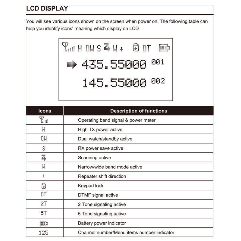 - Dual band, dual display, dual standby | DOT-MATRIX LCD display | A/B band independent operation | Repeater | 2 tone / 5 tone | Multi types for keys lock setting.