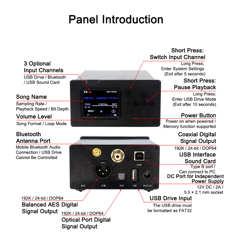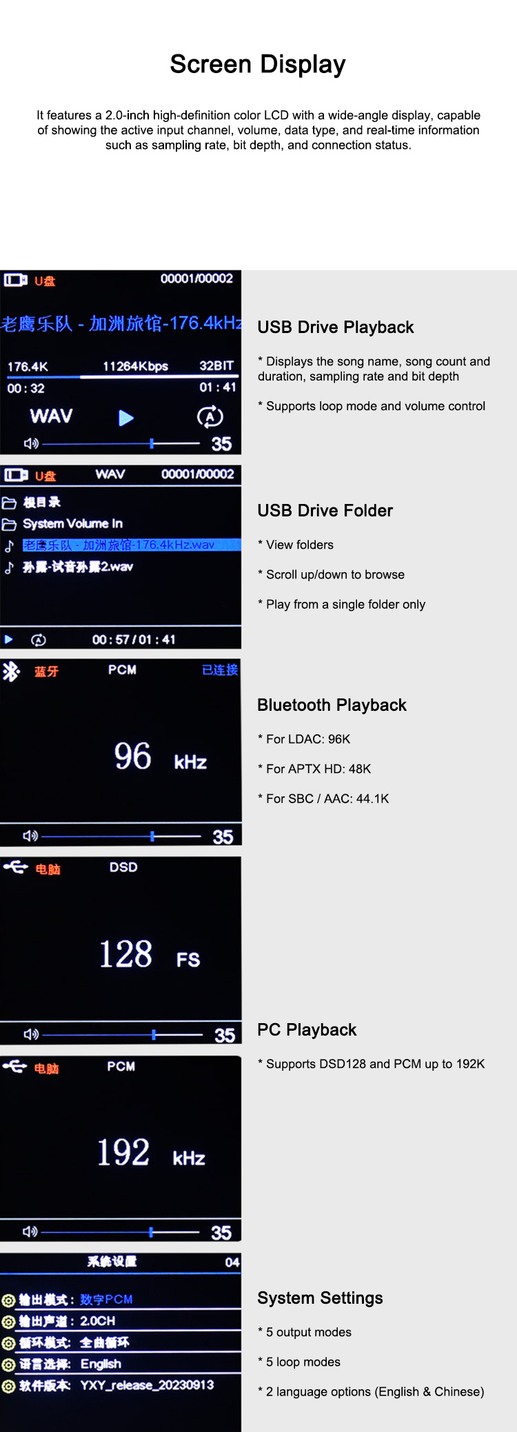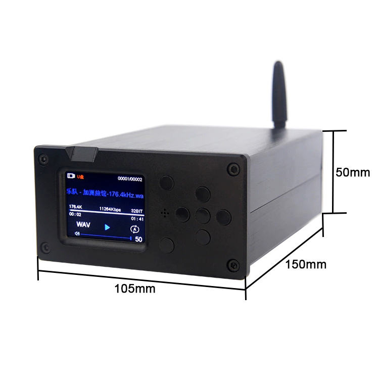 The USB flash drive player features a 2.0-inch high-definition color LCD with a wide-angle display, capable of showing the active input channel, volume, data type, and real-time information such as sampling rate, bit depth, and connection status.