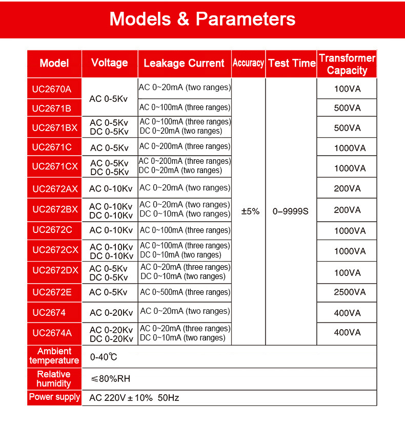 The withstand voltage tester series is designed in compliance with international and Chinese safety standards, including IEC, CSA, UL, and JIS. It is suitable for a wide range of applications, including household appliances, power switches, wires and cables, transformers, terminals, high-voltage bakelite electrical appliances, motors, medical devices, chemical equipment, instrumentation, and high-voltage systems. It is ideal for conducting safety tests such as withstand voltage and leakage current testing. Moreover, it is an indispensable tool for research laboratories and technical supervision departments performing withstand voltage tests.