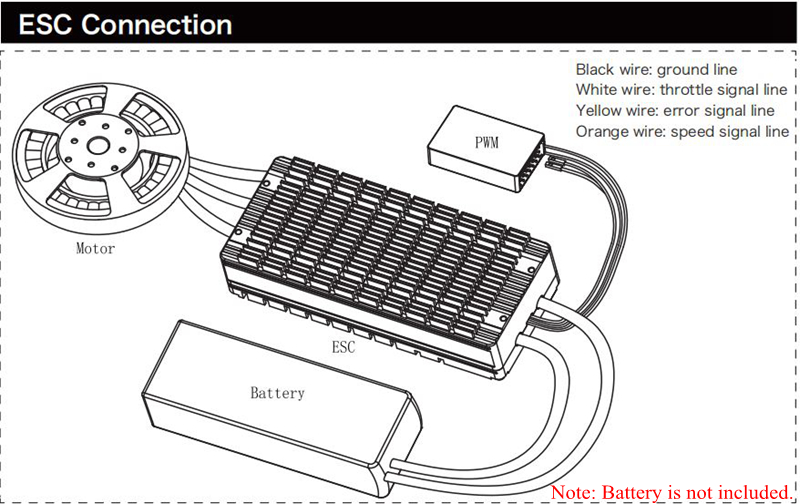 - Start Protection: When motor is not started up after adding throttle for 10 seconds, ESC will shut off and will resume normal after making throttle zero.